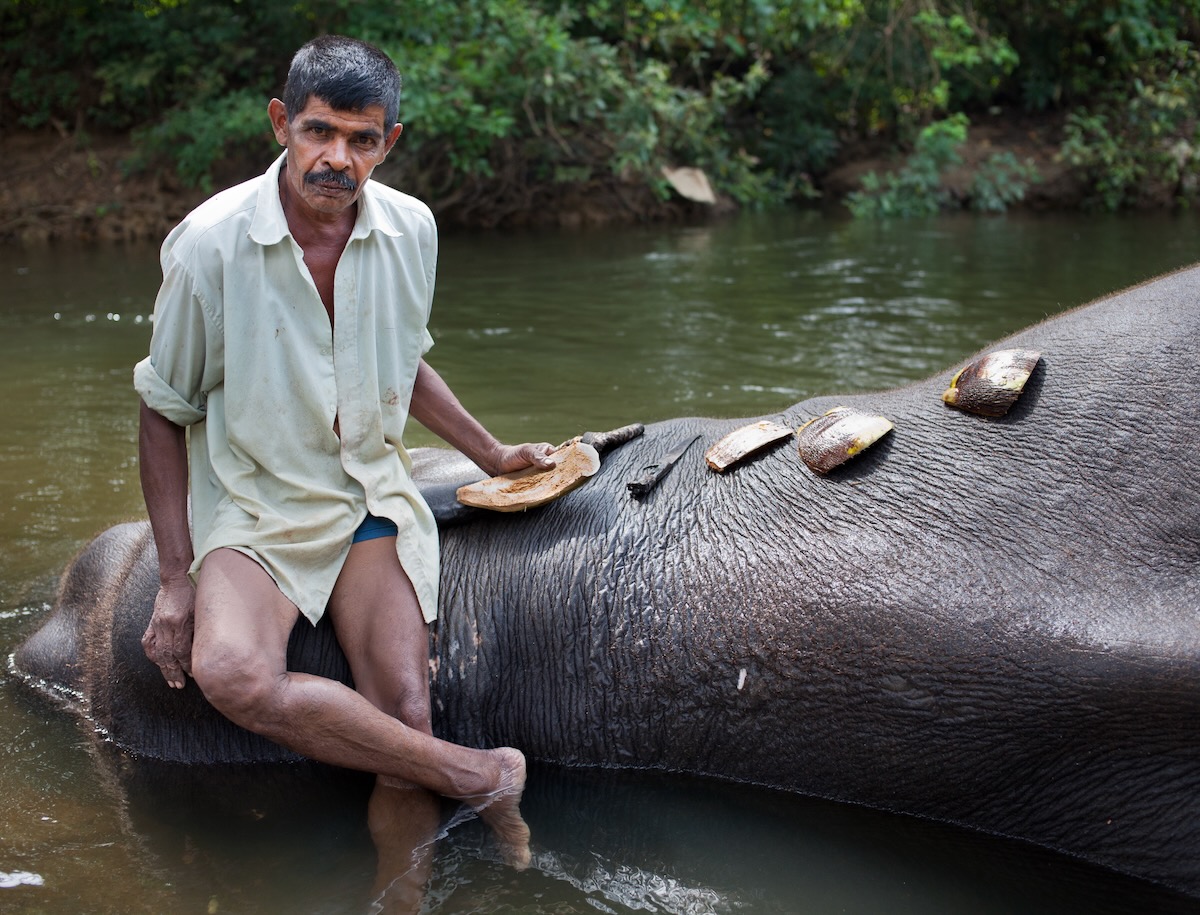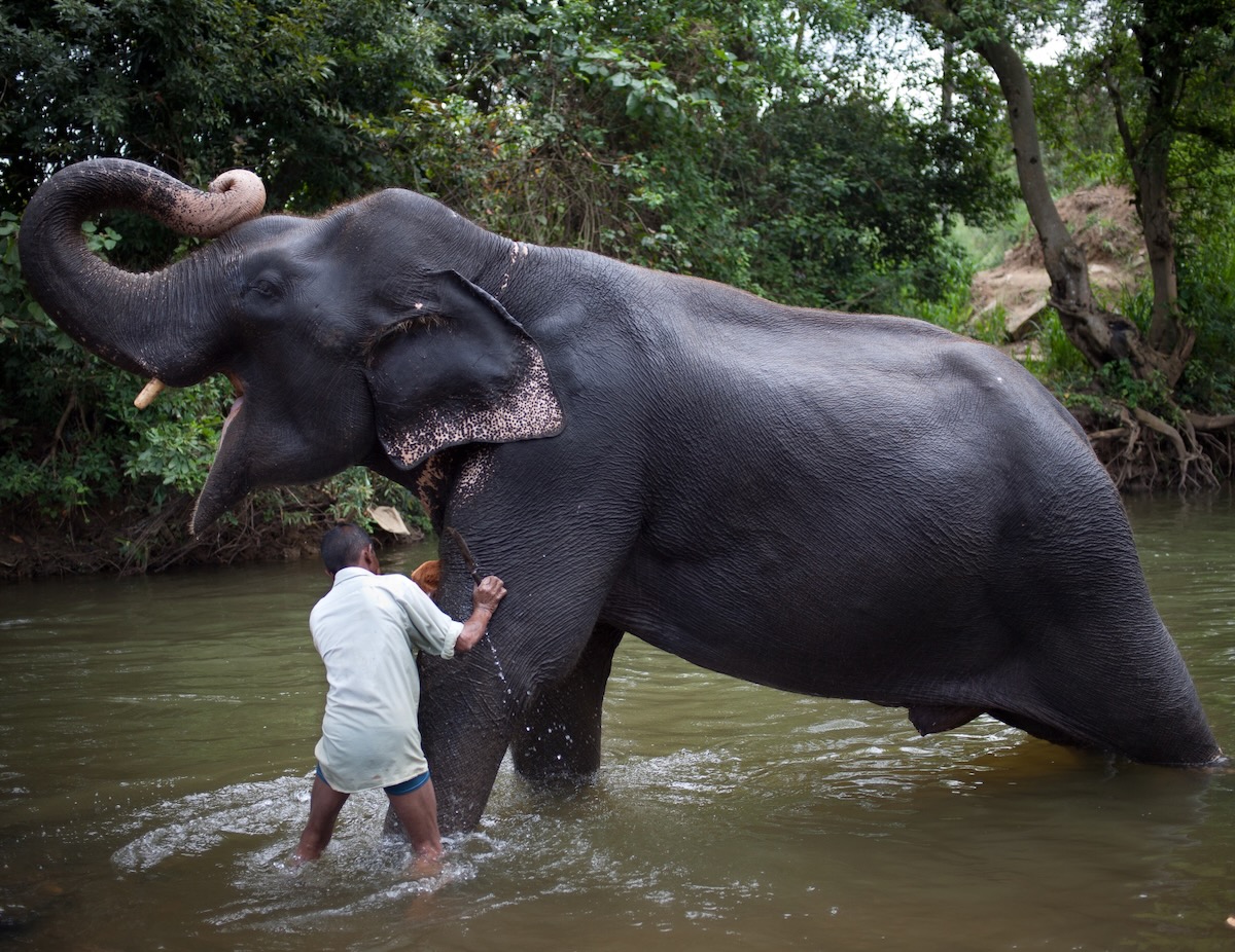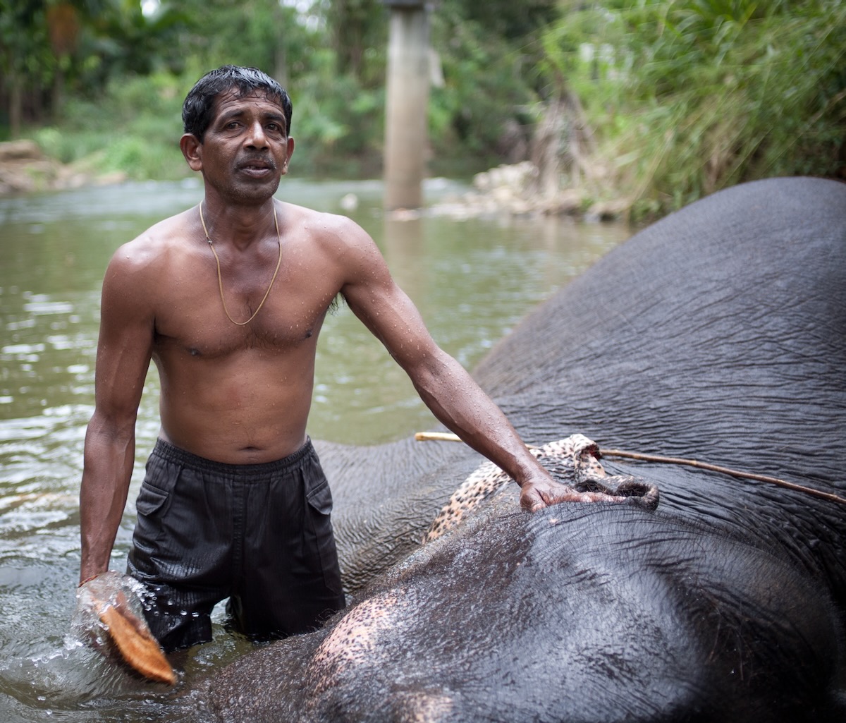 Anyways, I headed that morning out, asking around to find the creek. It is right under a small bridge. I saw two elephants being scrubbed by their mahouts. I went down and asked if I could photograph them, and they agreed. Mahouts use the skin of coconut and cut it in a wedge-shape and use it to scrub the elephants. It is a very time-consuming task, given the massive size of the elephant. It was very nice to see, and there were loads of photo possibilities.
