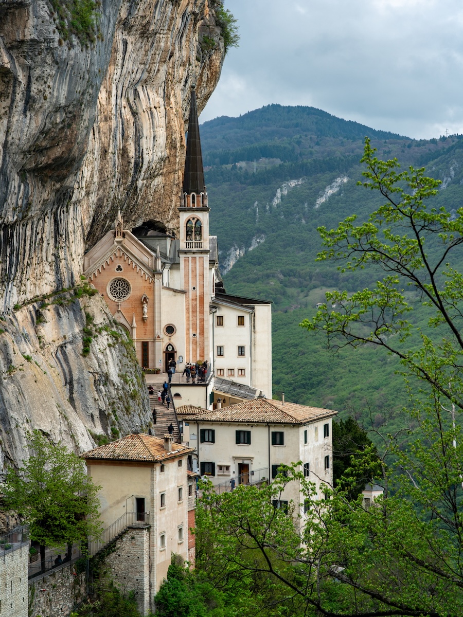 The highlight of our Lake Garda experience was visiting the Sanctuary of Madonna della Corona, a remarkable pilgrimage site built into a sheer cliff face 774 meters above sea level. This extraordinary sanctuary, perched dramatically on Mount Baldo, has been a place of worship since medieval times. The current structure, rebuilt in the 1970s, seems to emerge directly from the rock face, creating one of the most spectacular religious sites in Italy.