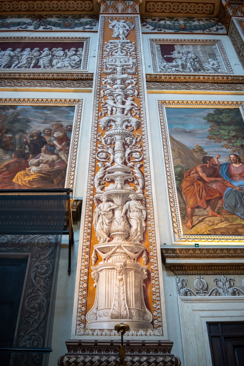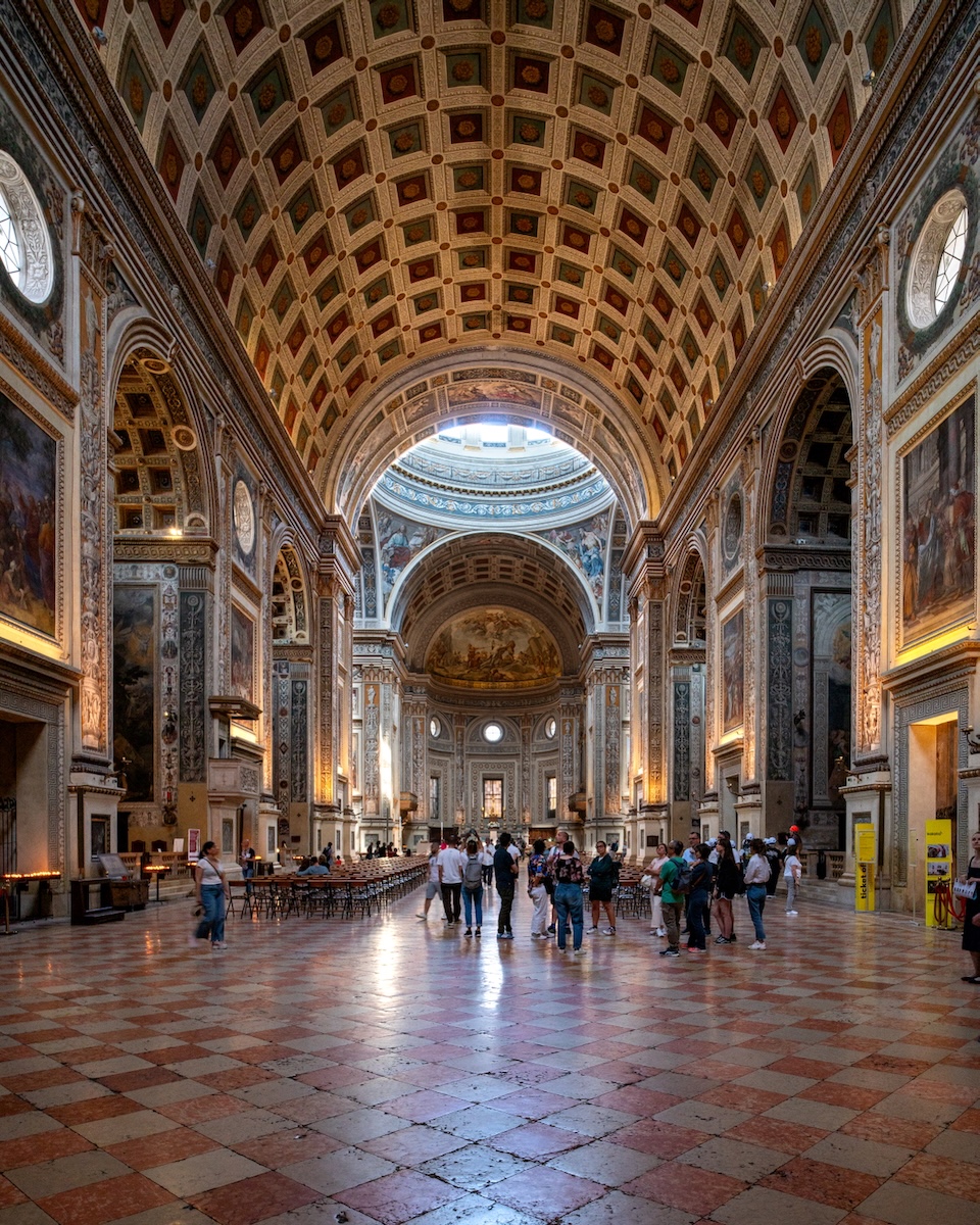 The Basilica di Sant’Andrea emerged as our visit’s absolute highlight, featuring one of the most spectacular church interiors I’ve ever encountered. The walls showcase extraordinary trompe-l’oeil paintings that create convincing three-dimensional effects through masterful use of shadows and perspective, making flat surfaces appear to have architectural depth and sculptural relief. This artistic technique transforms the interior into a mesmerizing blend of painting and architecture that must be seen to be believed.